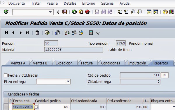 Visualizamos que sólo tiene un reparto, lo cual hasta ahí... Según el objetivo indicado inicialmente: 'cada posición deber tener un sólo reparto'; esta bien... Pero, vemos que la cantidad del pedido y la cantidad confirmada son diferentes: